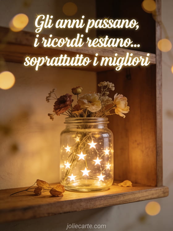 Condividi questo biglietto fotorealistico con barattolo luminoso, fiori secchi e bokeh dorato per un'atmosfera nostalgica. Scopri anche immagini compleanno umorismo uomo, messaggio compleanno divertente e uomo gif compleanno umorismo.