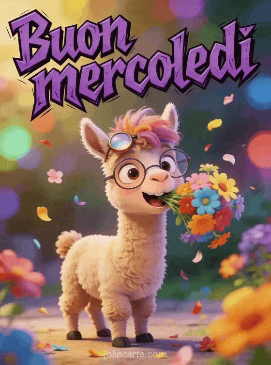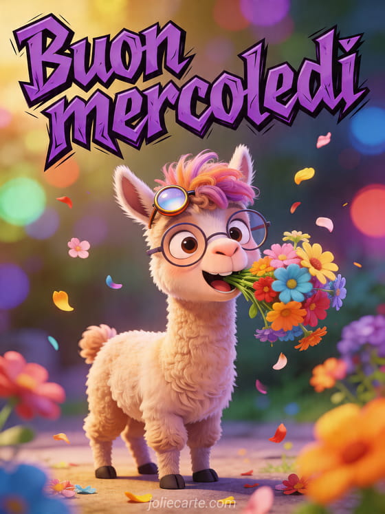 Invia un biglietto di Buon mercoledì pieno di umorismo con un lama buffo e fiori colorati. Scopri anche belle cartoline virtuali gratis buon mercoledì, sorriso giornata sorriso buon mercoledì e immagine mercoledì piovoso.