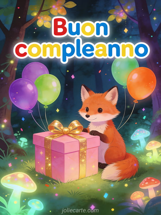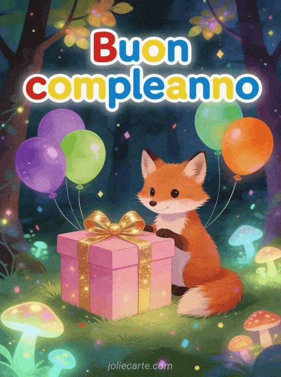 Festeggia con questo biglietto di buon compleanno dal clima incantato, con una volpe adorabile, un regalo con fiocco dorato e palloncini colorati. Scopri anche buon compleanno gif rosso, molto buon compleanno e buon compleanno champagne.