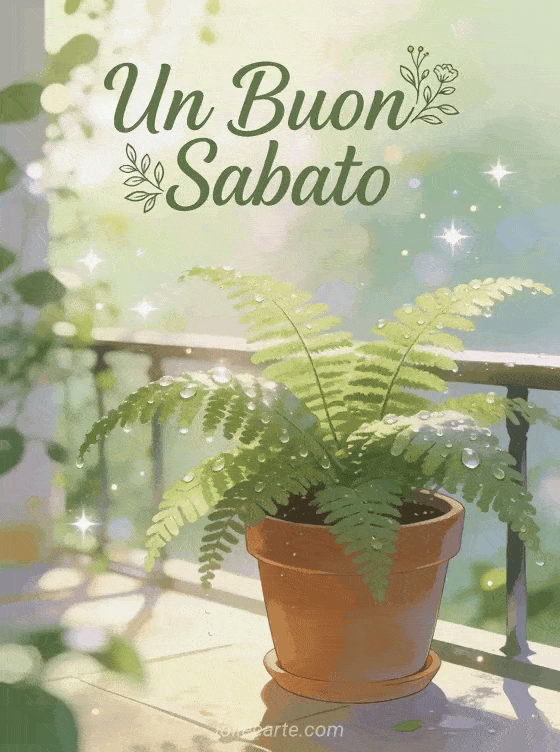 Un buon sabato un fresco e naturale saluto di sabato con una felce con rugiada su una terrazza mattutina