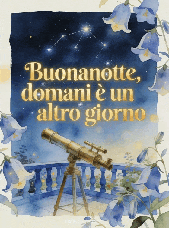 Condividi buonanotte, domani è un altro giorno con una scena notturna speranzosa ad acquerello, un telescopio di ottone puntato verso una costellazione luminosa, una terrazza blu di giardino e campanule. Puoi inviare anche un messaggio romantico buonanotte, un messaggio per augurare buonanotte a un'amica o una cartolina per augurare buona notte.