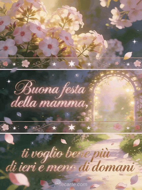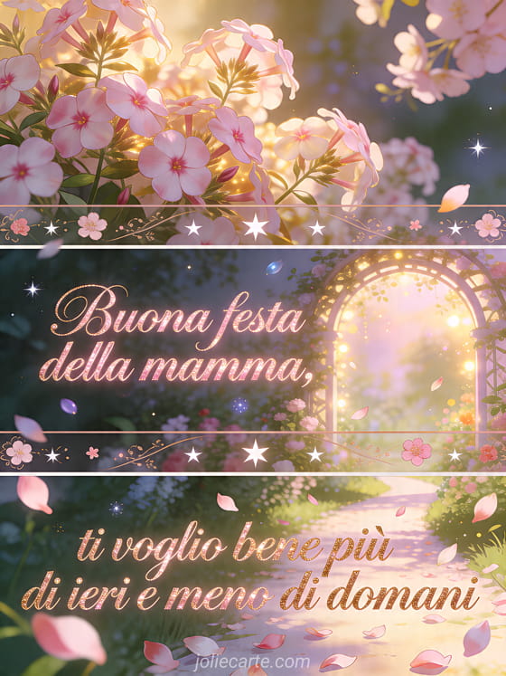 Condividi una poesia per la festa della mamma in un'illustrazione sognante a tre pannelli con phlox rigoglioso, arco da giardino luminoso, petali sospesi su un sentiero chiaro, fiori e stelle. Scopri anche immagini per la festa della mamma, poesie della festa della mamma o fotografia per la festa della mamma.