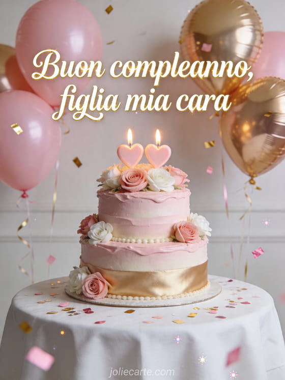 Festeggia tua figlia con questa dolce cartolina di compleanno con una torta elegante, candele, palloncini rosa e dorati e coriandoli scintillanti. Puoi anche scoprire piccola poesia di compleanno per mia figlia, poesia per compleanno per mia figlia o biglietto compleanno figlia adulta.