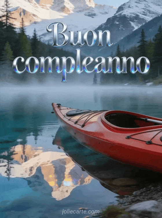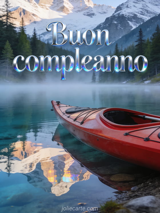 Invia un impressionante biglietto di compleanno con un kayak rosso accanto a un lago di montagna cristallino all'alba, con perfetti riflessi delle cime innevate. Scopri anche un biglietto compleanno uomo gratis umorismo o buon compleanno uomo.