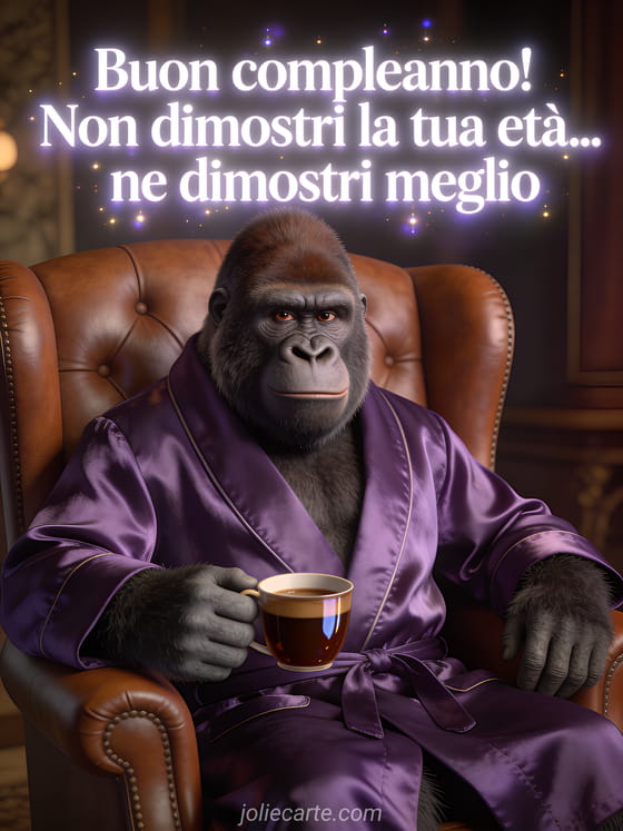 Condividi questo biglietto umoristico con un gorilla elegante in vestaglia di seta che beve caffè in una poltrona classica. Scopri anche buon compleanno divertente, compleanno gatto umorismo e video compleanno spassoso.
