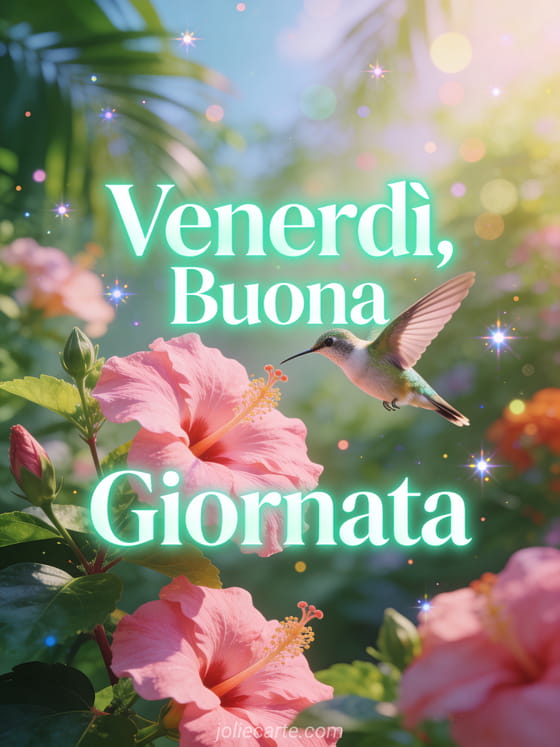 Augura a qualcuno un meraviglioso venerdì con questo bellissimo biglietto tropicale con colibrì. Scopri anche un biglietto buona giornata di venerdì o un biglietto buon venerdì primaverile.