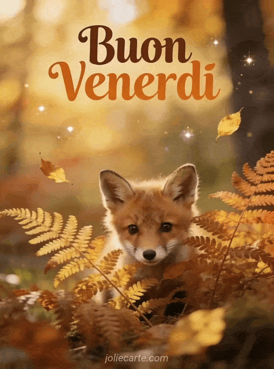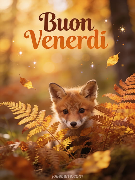 Festeggia il venerdì con questo incantevole biglietto con una curiosa volpina che sbircia tra felci autunnali con foglie dorate che cadono nella calda luce del bosco. Scopri anche un' immagine venerdì buongiorno, un messaggio per augurare un buon venerdì o un biglietto buon venerdì.