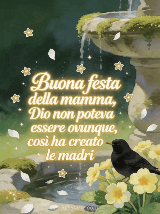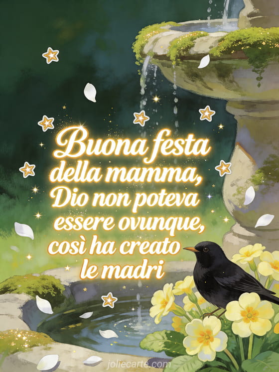 Condividi un biglietto celebrativo per la festa della mamma con scrittura luminosa, stelle dorate, petali bianchi, un merlo nero tra primule e una fontana di pietra muschiosa. Scopri anche immagini della festa della mamma, un disegno festa della mamma o buongiorno e buona festa della mamma.