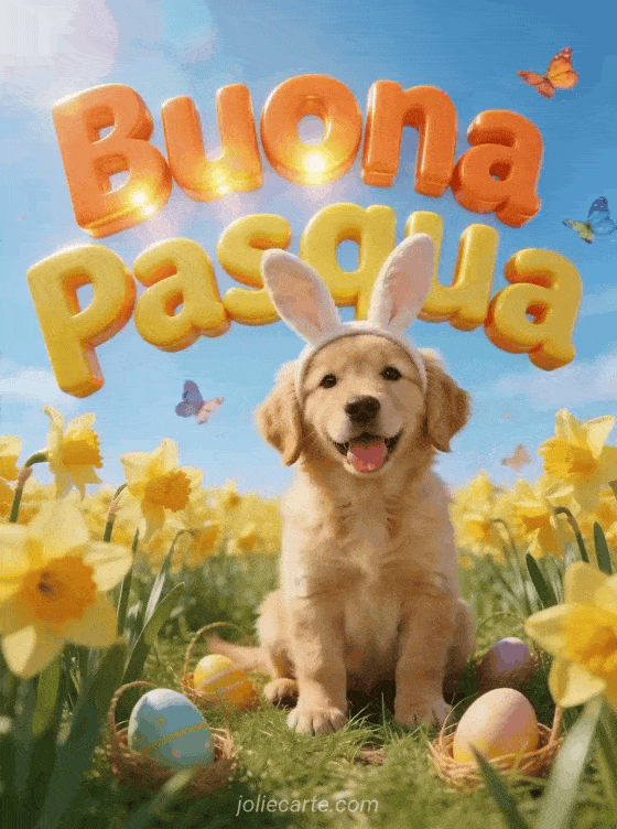Condividi questo adorabile augurio di Pasqua con un cucciolo golden retriever con orecchie da coniglio seduto in un campo di narcisi con uova di Pasqua nascoste nell'erba e farfalle colorate.