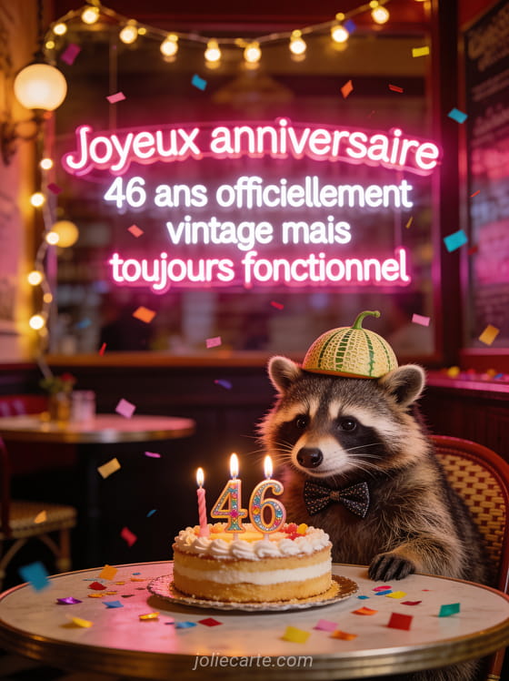 Joyeux anniversaire 46 ans - Humour T'inquiète, tu fais toujours plus jeune… de loin. Joyeux anniversaire Joyeux anniversaire 46 ans - Texte homme Joyeux anniversaire 46 ans place à la fête ! Joyeux anniversaire 46 ans - Femme Joyeux anniversaire Joyeux anniversaire 46 ans - Femme humour Toujours plus vieux, jamais plus sage. Bon anniversaire