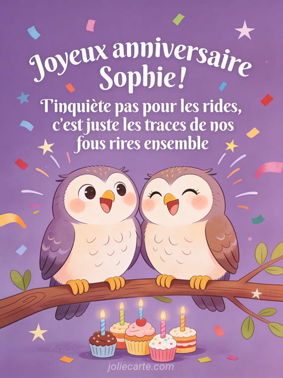 Télécharger le GIF animé joyeux anniversaire Sophie ! T'inquiète pas pour les rides, c'est juste les traces de nos fous rires ensemble