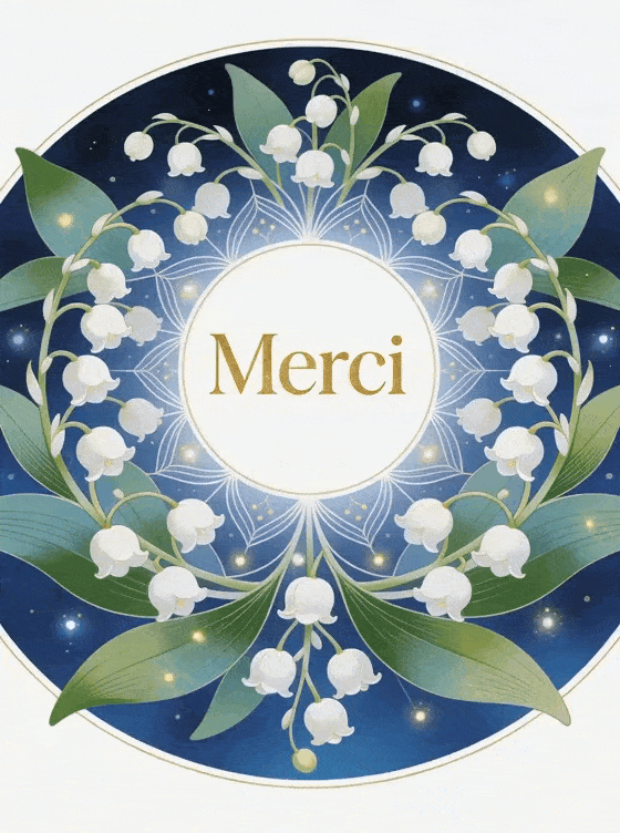 Partagez ce mandala de muguet aux motifs symétriques et lumineux pour un merci original et raffiné. Explorez aussi une aquarelle de muguet, une image merci muguet ou un merci porte-bonheur.