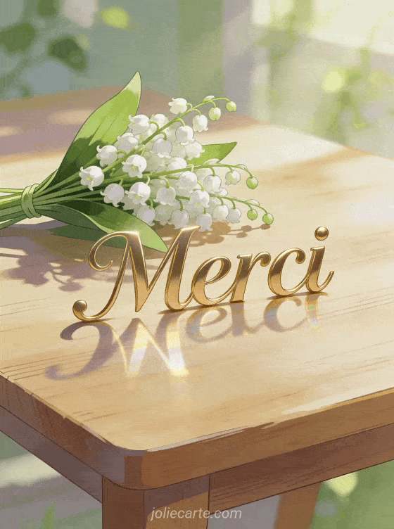 Envoyez cette image « Merci » ornée de muguet pour remercier avec élégance et douceur printaniÚre. Découvrez aussi un merci porte-bonheur, un remerciement fleuri ou un merci printanier.