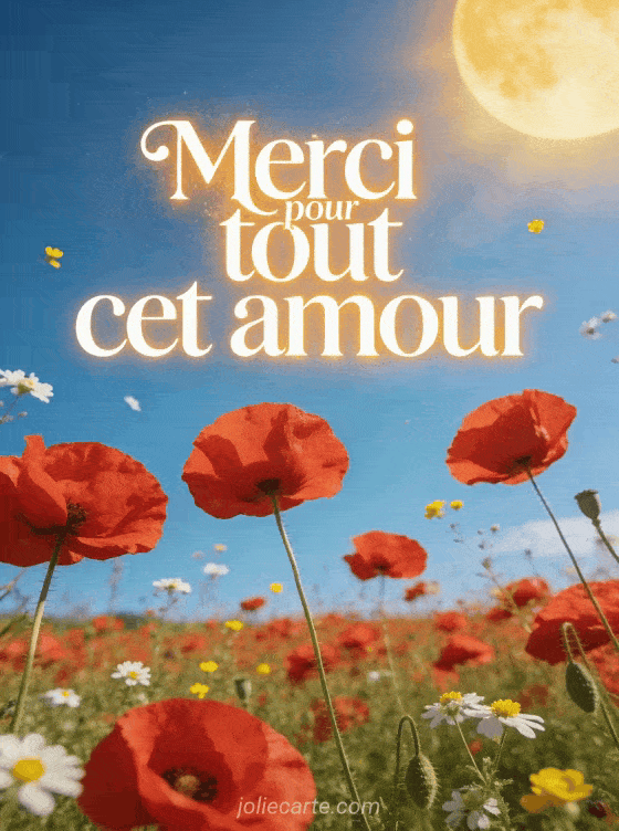 Dites merci pour tout cet amour avec cette image radieuse et champĂȘtre pour exprimer votre gratitude profonde. DĂ©couvrez aussi un merci pour tout l'amour que tu me donnes, un merci pour ce week-end mon amour ou un bonheur merci mon amour.