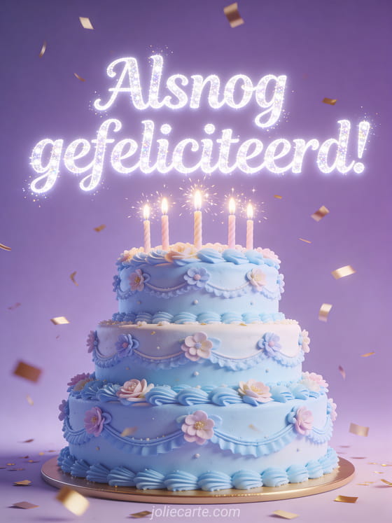 Een prachtige 3D drielaagse taart met pastelblauwe room en suikerbloemen, voor een vrolijke late gelukwens. Bekijk ook afbeelding verjaardag met vertraging of alsnog gefeliciteerd wensen.