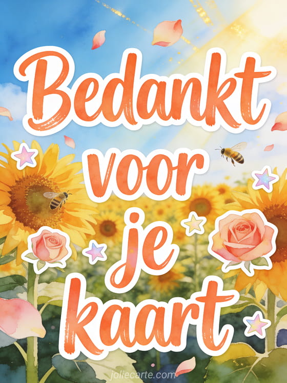 Stuur een prachtige afbeelding om te bedanken voor een kaart met een stralend zonnebloemen veld. Ontdek ook een cybercarte bedankt voor je kaart, een virtuele kaart bedankt voor je kaart of een bedankt voor uw kaart die ons erg heeft geraakt.