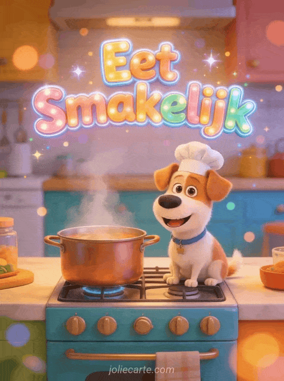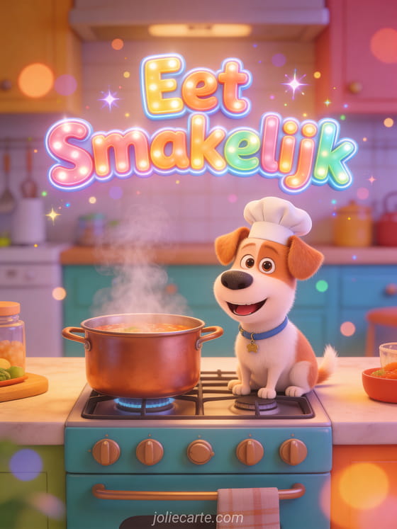 Stuur een leuke eet smakelijk groet met deze gratis wenskaart. Een schattige illustratie met een vrolijk hondje in een koksmutsje bij een dampende pot, perfect om goede eetlust te wensen.