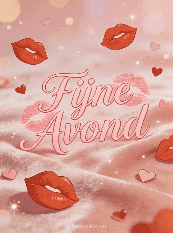 Stuur een lieve fijne avond en kusjes afbeelding via deze gratis wenskaart. Zwevende rode lippen en hartjes confetti op een zachte fluwelen achtergrond, een zoete genegenheidsvolle sfeer met roze en rode tinten. Bekijk ook een fijne avond aan alle geliefden of een spreuk fijne avond.