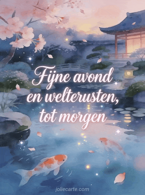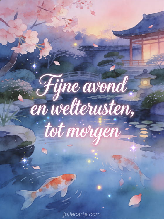 Deel een serene avondgroet met deze zenkaart in een Japanse tuin bij schemerlicht, met koi in de vijver en vallende kersenbloesemblaadjes. Ontdek ook fijne avond welterusten kusjes tot morgen, landschap fijne avond tot morgen of fijne avond en goede nacht kusjes tot morgen.