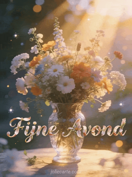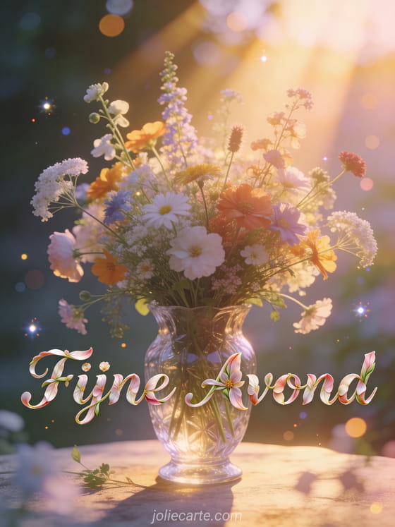Stuur een prachtige fijne avond afbeelding met bloemen via deze gratis wenskaart. Een prachtig boeket wilde bloemen in een kristallen vaas verlicht door zachte avondzonnestralen, een frisse natuurlijke sfeer met zachte pastelkleuren. Bekijk ook een fijne avond en nacht kusjes of een fijne avond bij de open haard.