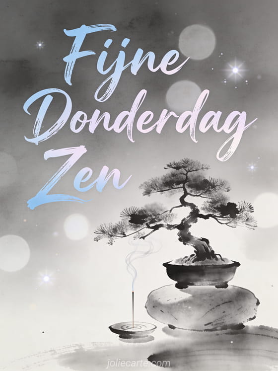 Deel een minimalistische donderdaggroet met een serene bonsai op een stenen voetstuk en zacht opstijgende wierookrook. Ontdek ook een fijne donderdag moed of een mooie dag van donderdag kaart.
