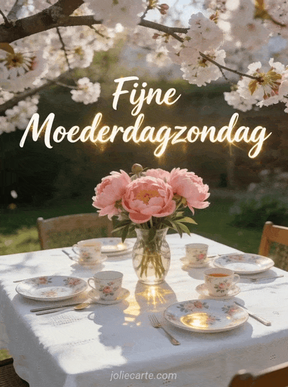 Deel deze lichtgevende kaart met een elegante brunch tafel buiten onder kersenbloesem en pioenrozen. Ontdek ook gratis moederdag afbeelding of moederdagkaart.
