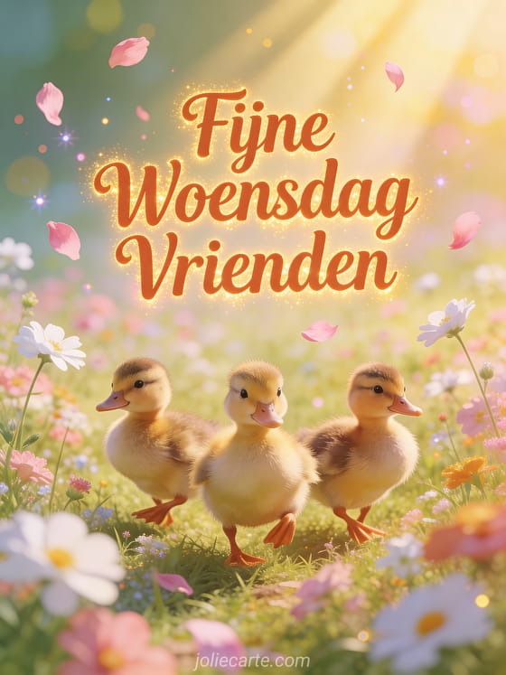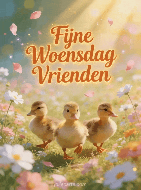 Deel een vrolijke woensdag met je vrienden dankzij deze schattige eendenkuikenskaart. Ontdek ook een kaart fijne middag woensdag of een gif goedemorgen woensdag.