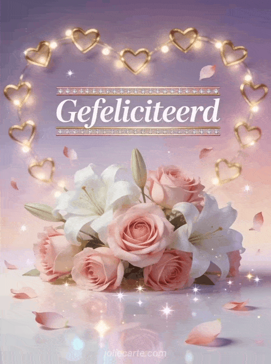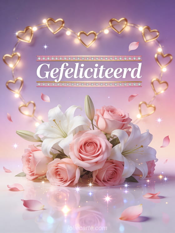Stuur een prachtige gefeliciteerd afbeelding voor een jong meisje met roze rozen, witte lelies en gouden hartlichtjes. Bekijk ook een afbeelding gefeliciteerd tiener of een verjaardagskaart tieners.
