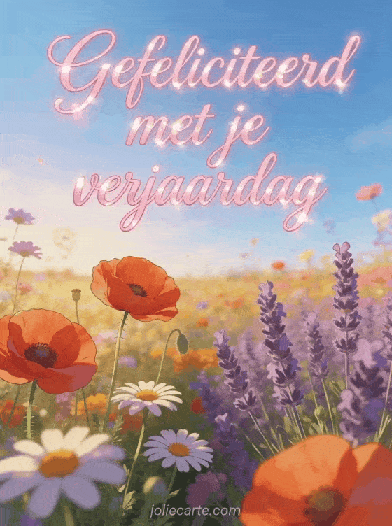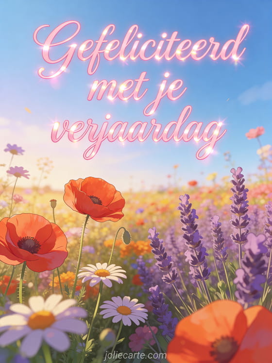 Vier met een stralende verjaardagskaart met bloemenveld onder blauwe lucht, met klaprozen, margrieten, lavendel en gouden namiddaglicht. Bekijk ook gefeliciteerd met je verjaardag muzikaal, gefeliciteerd met je verjaardag afbeeldingen en gefeliciteerd met je verjaardag kat.