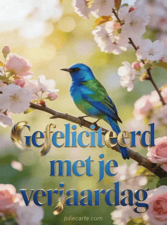 Stuur een vrolijke gratis verjaardagskaart met een prachtige blauwe en groene vogel op een bloeiende kersenboom. Ontdek ook gratis gif gelukkige verjaardag, gelukkige verjaardag lieve of gelukkige verjaardag kat champagne.