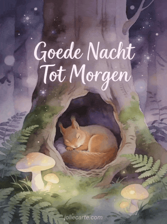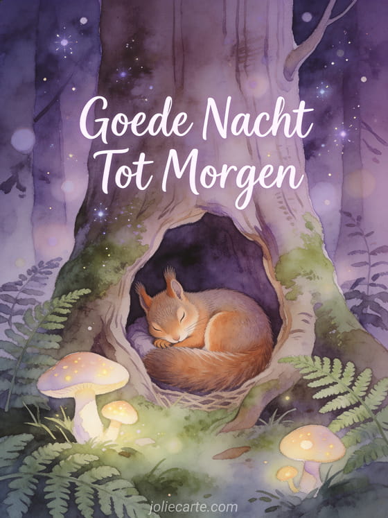 Stuur een vredige afbeelding goede nacht tot morgen met een slapende eekhoorn genesteld in een gezellige boomholte, verlicht door zachte gloeiende paddenstoelen en bosvaren in een nachtelijke sprookjessfeer. Ontdek ook een tot morgen goede nacht kaart of een afbeelding goede nacht kusjes tot morgen kaart of een citaat goede nacht tot morgen kaart.