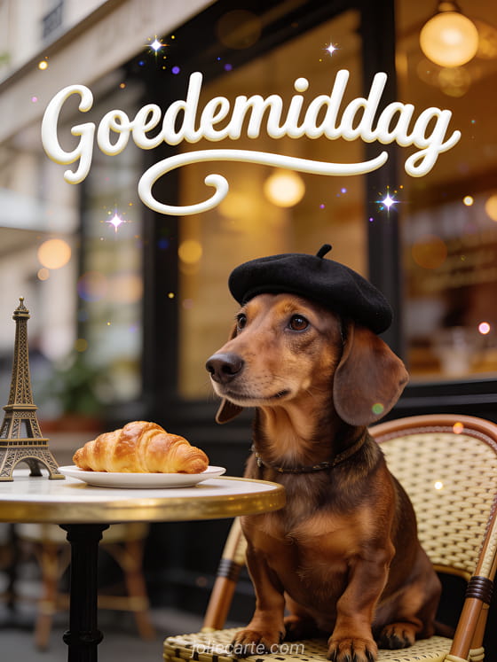 Deel een glimlach met deze grappige goedemiddag kaart met een teckel met baret in een Parijs café. Ontdek ook een kaart van gifs goede middag of ik wens je een fijne middag.