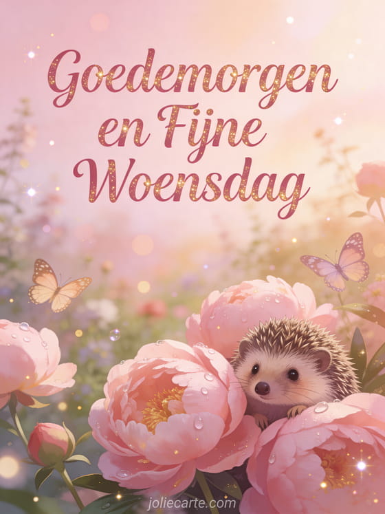 Stuur een charmante goedemorgen en fijne woensdag afbeelding via deze gratis wenskaart. Een charmante kleine egel die piept achter roze pioenrozen, zachte ochtenddauwdruppels glinsteren op de bloemblaadjes, betoverende lentetuin sfeer met vlinders. Bekijk ook een emoji fijne woensdag.