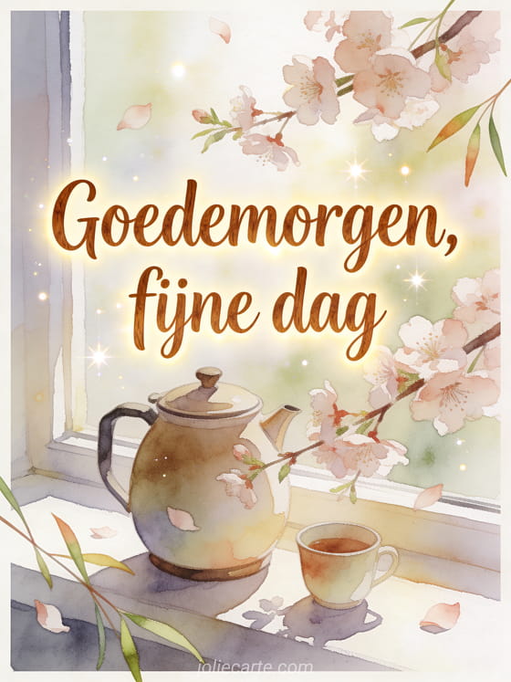 Wens een fijne dag met deze frisse aquarelkaart, met een ronde koffiekan, een klein kopje, takken met kersenbloesem, bloemblaadjes en een heldere vensterbank. Bekijk ook goedemorgen met koffie geanimeerde gif, goedemorgen goede koffie gif of goedemorgen mijn lief koffie.