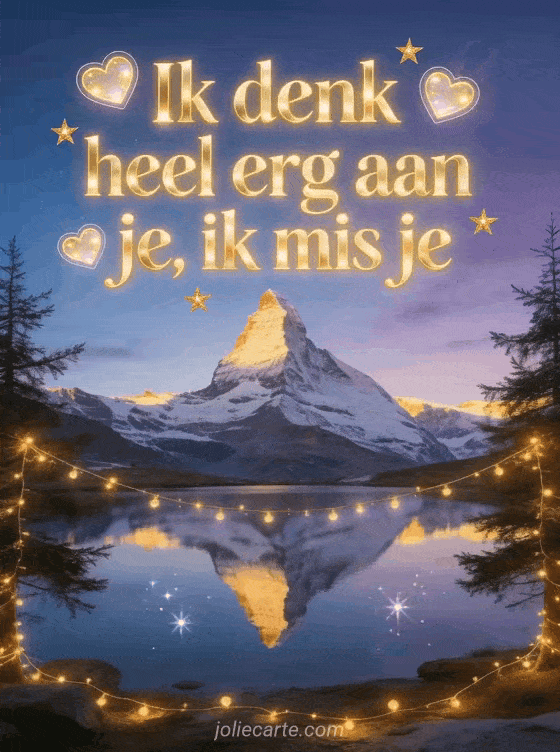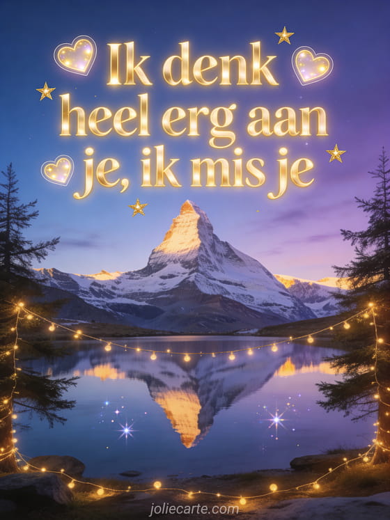 Verras je liefste met deze majestueuze romantische kaart met de Matterhorn weerspiegeld in een kalm alpenmeer bij schemering. Ontdek ook een afbeelding kus ik denk aan jou of een afbeelding ik hou van je ik denk aan jou.
