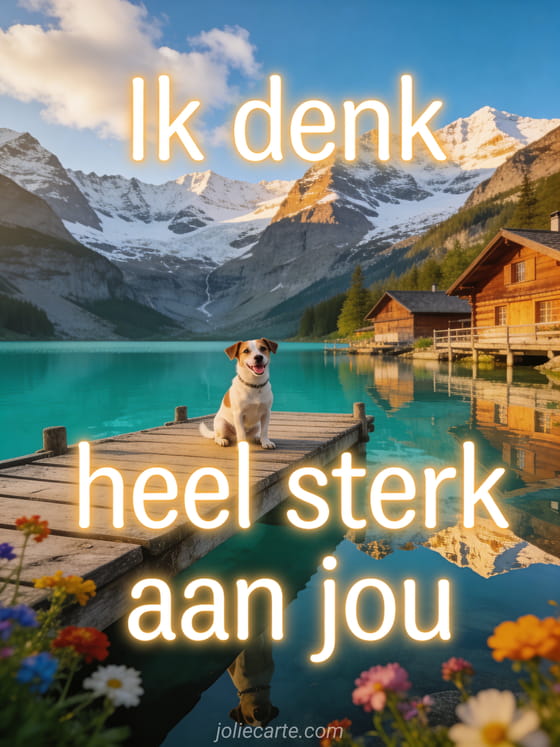 Stuur een prachtige kaart met een vrolijke Jack Russell terriër op een houten steiger aan een turquoise Alpenmeertje met besneeuwde bergen om iemand te laten weten dat je heel sterk aan hem denkt. Bekijk ook een ik denk aan jou kat, vanavond denk ik aan jou of clipart ik denk aan jou.