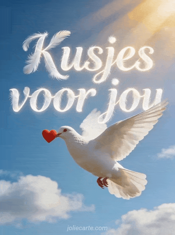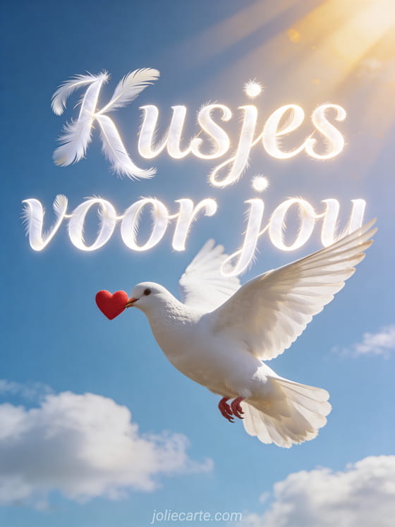 Stuur kusjes voor jou met deze mooie afbeelding van een witte duif die een rood hartje draagt in een stralend blauwe hemel. Bekijk ook kusjes koffie of afbeelding heel veel dikke knuffelzoenen.