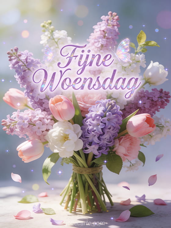 Stuur een frisse fijne woensdag afbeelding via deze gratis wenskaart. Een prachtig boeket van lentebloe men zoals seringen, tulpen en hyacinten, verse bloemenrangschikking met ochtendlicht, geurige lente sfeer met bloemblaadjes en bladeren verspreid. Bekijk ook een gifs fijne zonnige woensdag of een fijne woensdag schildpad.