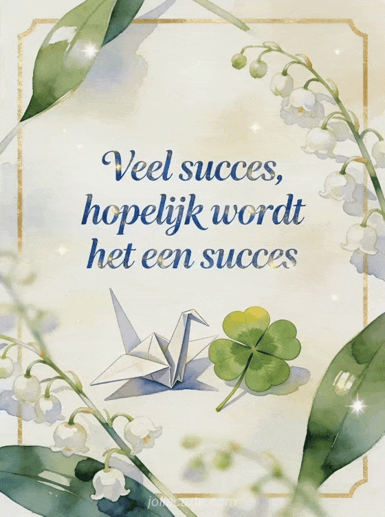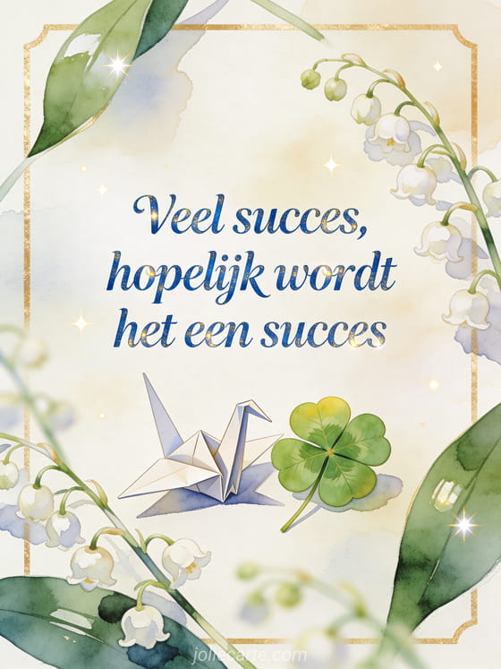 Deel een afbeelding om veel succes te zeggen met een gevouwen origamikraanvogel, een heldere geluksklaver en lelietje-van-dalen in een rustig aquareltafereel. Ontdek ook veel geluk geanimeerde gifs, een tekst om succes te wensen voor een examen of een veel succes bericht voor een wedstrijd.