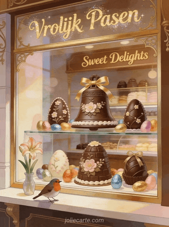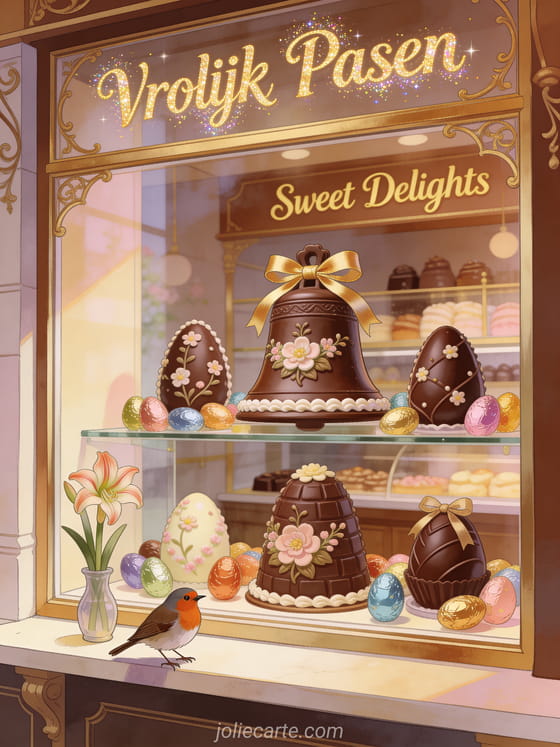 Stuur een mooie afbeelding met chocolade paasklokken en verras je dierbaren met dit feestelijke lenteontwerp. Bekijk ook een afbeelding van vrolijk pasen, afbeeldingen van vrolijk pasen of vrolijk pasen afbeeldingen.