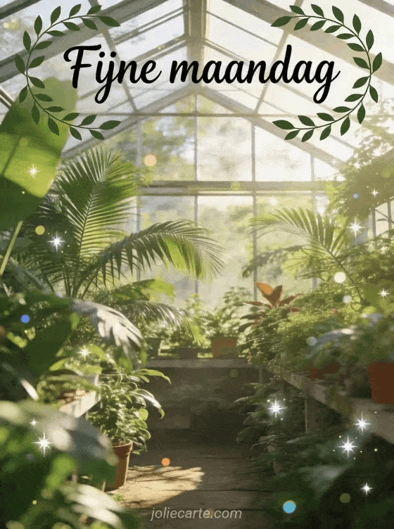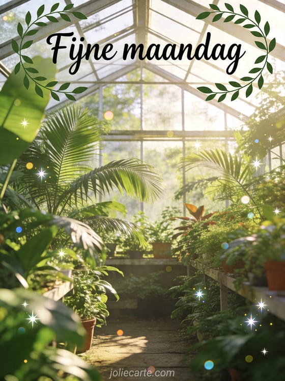 Stuur een Fijne maandag kaart met weelderige tropische planten in een kas voor een frisse start van de week. Bekijk ook goedemorgen maandag afbeeldingen, fijne maandag kusjes afbeelding en afbeelding fijne maandag en goede week.