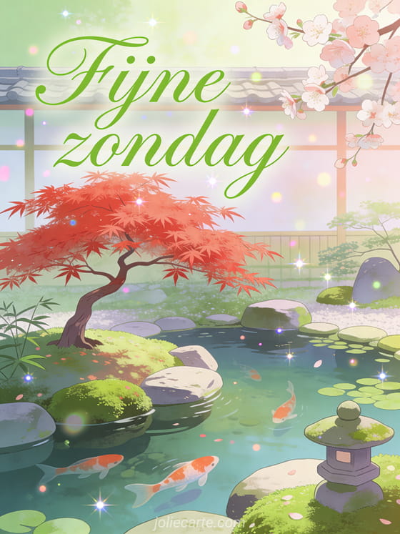 Deel een kalmerende fijne zondag groet met appelgroene sierletters, een serene Japanse tuin, een koivijver en een rode esdoorn in zen-sfeer. Ontdek ook een kaart voor fijne zondag met familie, een goedemorgen zondag afbeelding of een kaart voor fijne zondag mijn lief met kusjes.