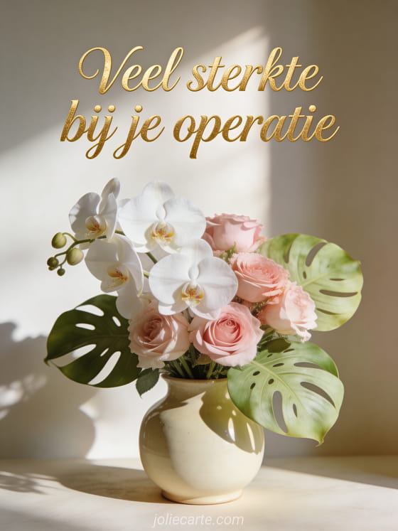 Stuur een elegante kaart met veel sterkte bij een operatie, versierd met prachtige witte en roze orchideeën in een crèmekleurige keramische vaas.