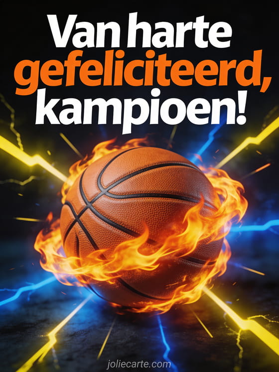 De perfecte kaart voor een tiener jongen die van sport houdt. Een realistische basketball close-up met gestileerde vlammen op een donkere achtergrond met energiebliksem — krachtig en dynamisch. Ontdek ook een verjaardagskaart tiener of een gefeliciteerd tiener.
