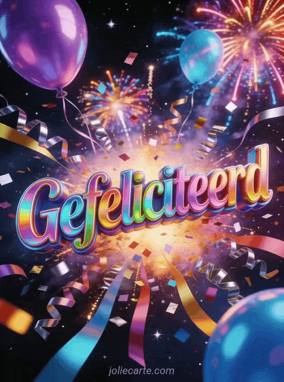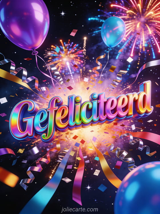 Stuur een energieke verjaardagsafbeelding voor een tiener met holografische letters, vuurwerk en neonballonnen. Bekijk ook een gefeliciteerd kaart tienermeisje of een tekst verjaardagskaart tienerjongen gratis.