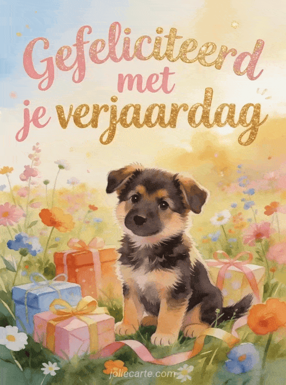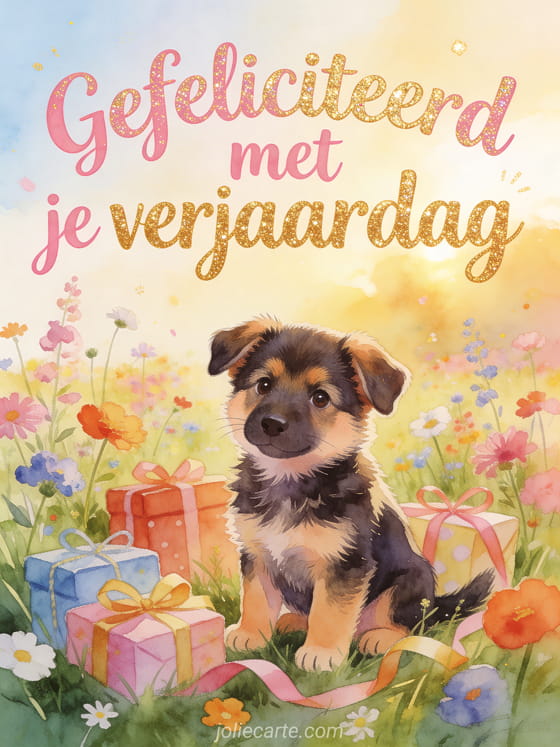 Verras een kind met deze schattige verjaardagskaart met een zachte Duitse herder puppy tussen wilde bloemen en cadeaupakjes. Ontdek ook een video gefeliciteerd baby of een gefeliciteerd kleine jongen.