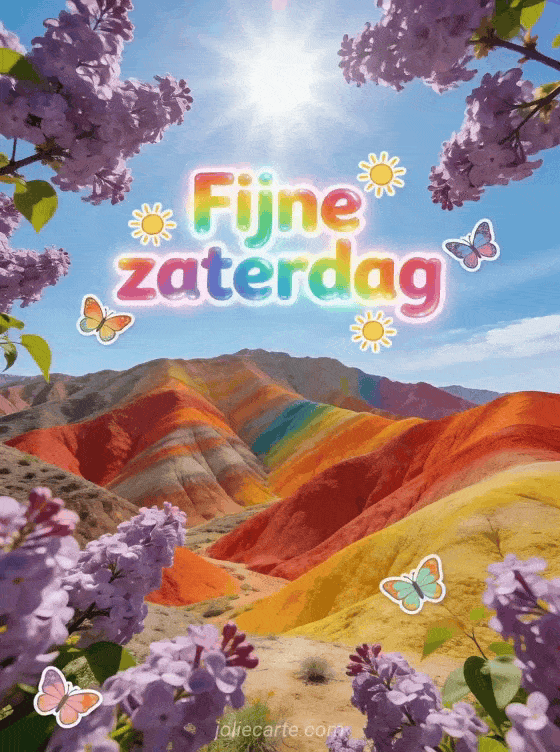 Deel een spectaculaire kaart voor fijne zaterdag met lichtgevende regenboogletters, stickers van stralende zonnetjes, kleurrijke vlinders, de rood, oranje en geel gestreepte bergen van Zhangye Danxia en paarse seringentakken op de voorgrond. Bekijk ook mooie dag fijne zaterdag kusjes, deze goedemorgen zaterdag kaart of zaterdag kusjes gifs.