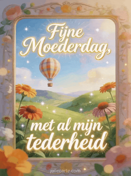 Deel een afbeelding voor Moederdag met vloeiende crèmekleurige letters, gouden rand en een speelse vallei-illustratie. Een gestreepte luchtballon zweeft boven heldere zinnia's en groene heuvels in deze vrolijke, dromerige kaart. Ontdek ook Moederdag kiekje, Moederdag gedichten of rijmen voor Moederdag.