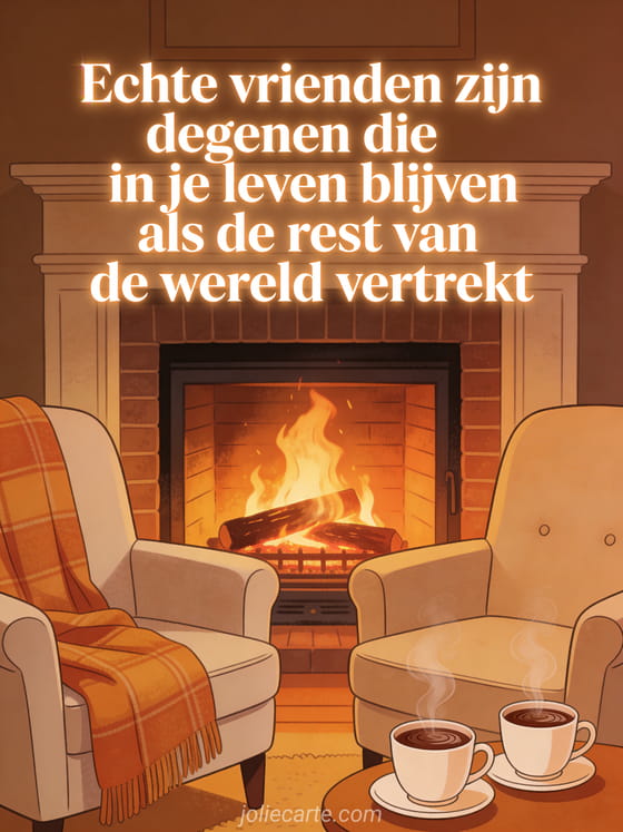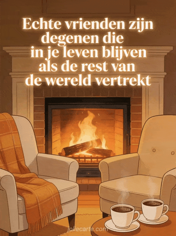 Stuur een intieme en gezellige kaart met twee fauteuils naast elkaar voor een knisperende open haard met warme chocolademelk en een plaid om een vriend te laten weten dat je aan hem denkt. Bekijk ook een fijne dag ik denk aan jou, boeket ik denk aan jou of gif ik denk aan jou grappig.