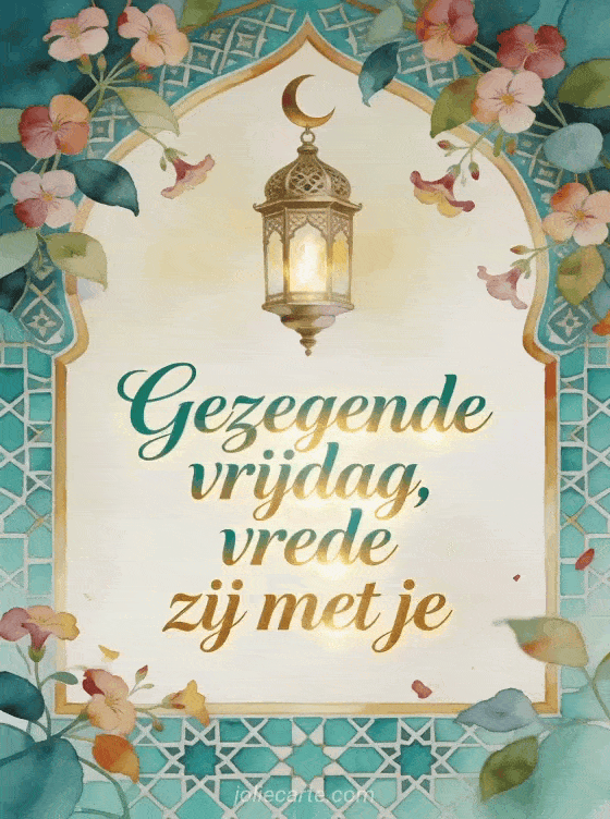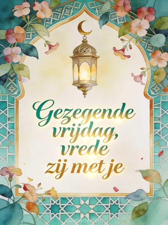 Stuur een vredige wens voor een gezegende vrijdag met smaragdgroene en gouden kalligrafie, aubrietabloemen, een sierlijke lantaarn, een halve maan en turquoise tegels. Ontdek ook afbeeldingen die een fijne vrijdag wensen, een fijne vrijdag gratis afbeelding of fijne vrijdag met afbeelding.